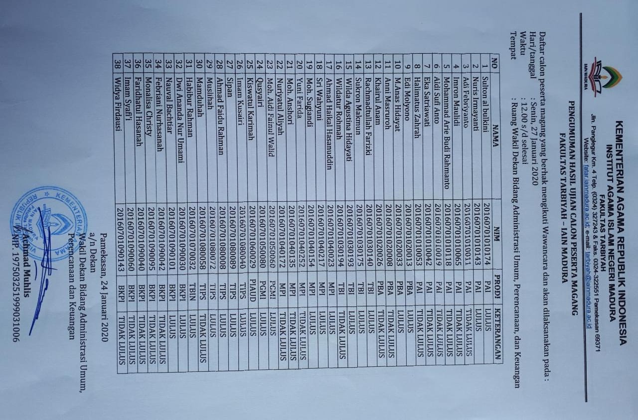 PENGUMUMAN HASIL UJIAN CALON PESERTA MAGANG FATAR